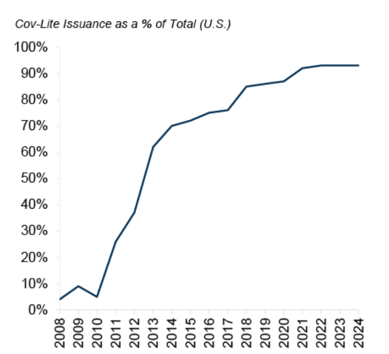 Covenants, especially maintenance covenants that require the borrower to continuously satisfy specific financial tests at regular intervals, are designed to serve as early warning systems. These early warning signs trigger corrective action before a borrower’s financial problems become irreversible. Yet today’s private credit market increasingly resembles the syndicated loan market of the late 2000s: covenant-lite, borrower-friendly, and light on accountability.